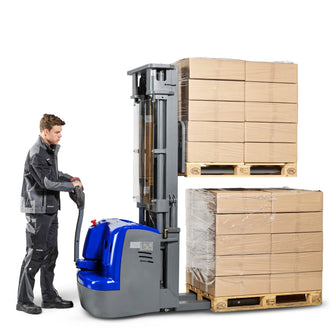 Our electric reach stacker with initial lift DOUBLE-M is suitable for storing and retrieving goods from shelves. The reach stacker is equipped with an initial lift function and can therefore be loaded with double pallets up to 120 mm.